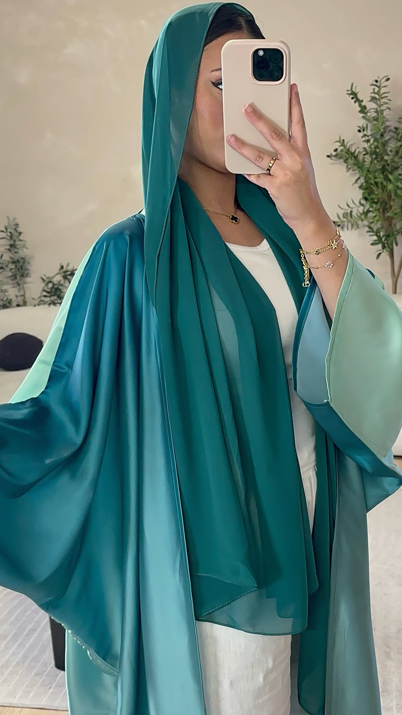 The abaya's contrast of shades from light to dark provides a unique touch and a touch of elegance that will stun all. The matching chiffon hijab that is included makes sure that everything about your outfit is flawlessly coordinated.