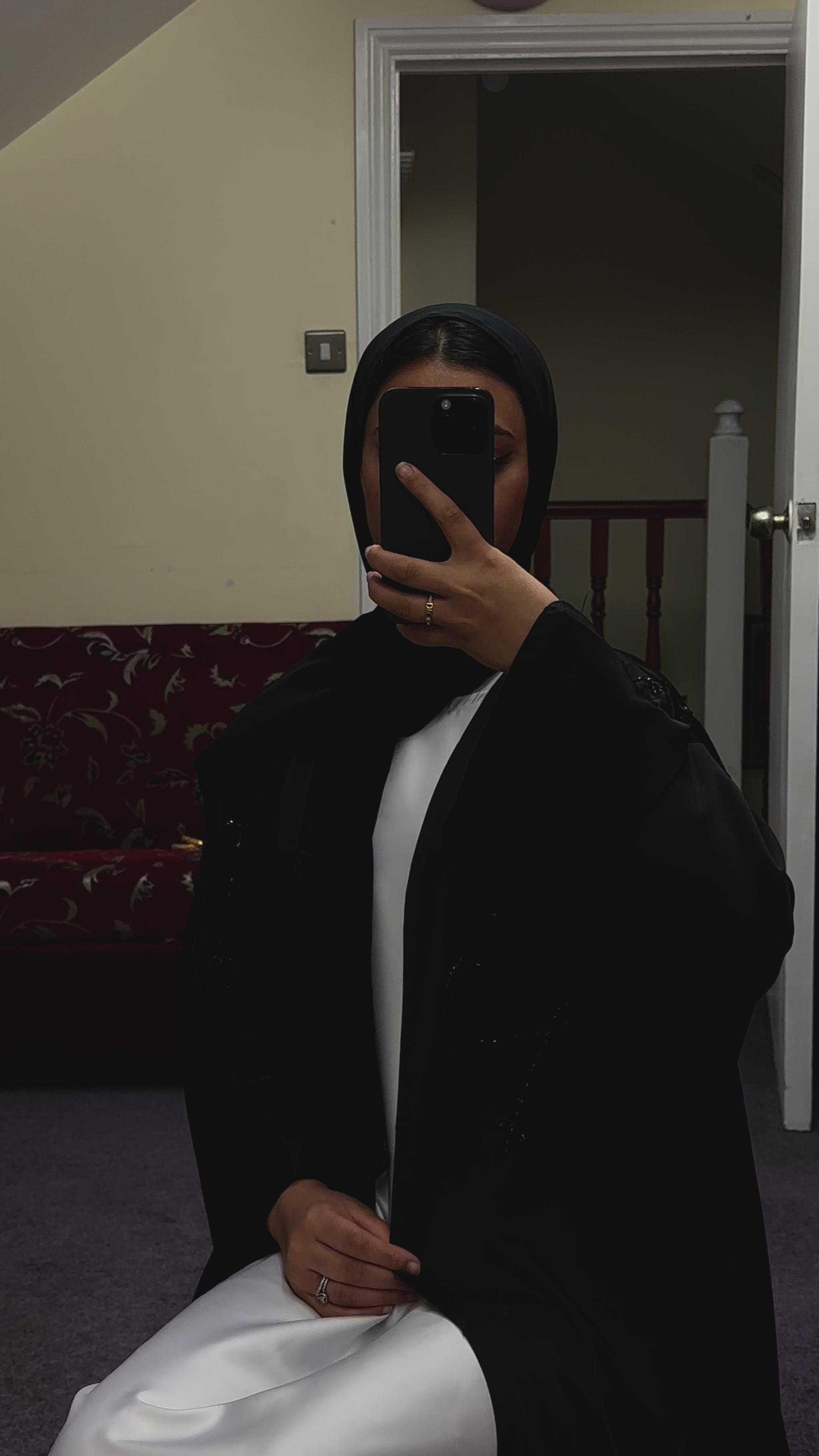 A timeless black abaya that comes with a matching hijab. Can be worn open or closed (pop studs). This abaya has black embellishments on the chest and sleeve area which adds a very elegant and luxury look to the abaya.