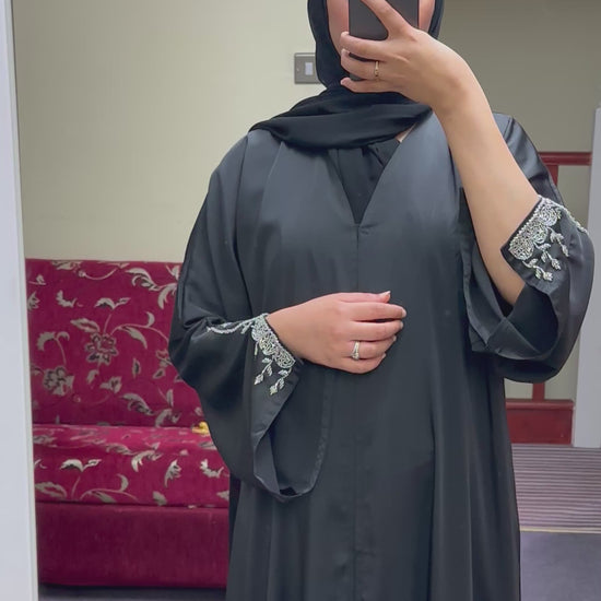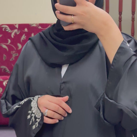 A timeless black abaya that comes with a matching hijab and can be worn open or closed (pop studs) . This abaya has a slit sleeve detail full of white embellishments which adds a very elegant and luxury look to the abaya.