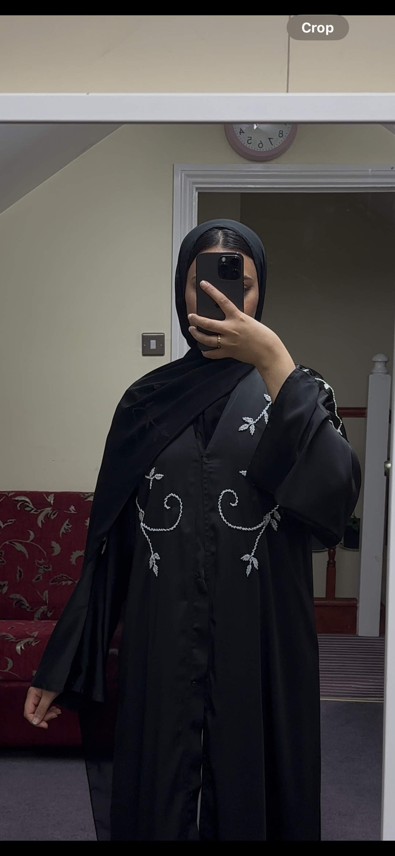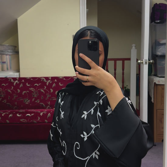 A timeless black abaya that comes with a matching hijab. Can be worn open or closed (pop studs). This abaya has white embellishments on the chest and sleeve area which adds a very elegant and luxury look to the abaya.